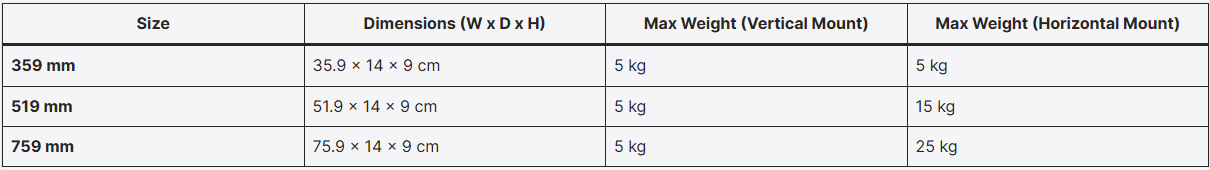 | Size | Dimensions (W x D x H) | Max Weight (Vertical Mount) | Max Weight (Horizontal Mount) |