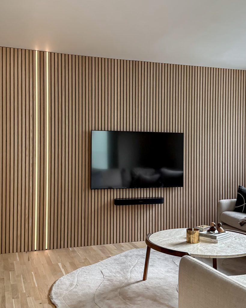 Placing an LED strip between the two slats of the WoodUpp Akupanel creates a stunning effect.
